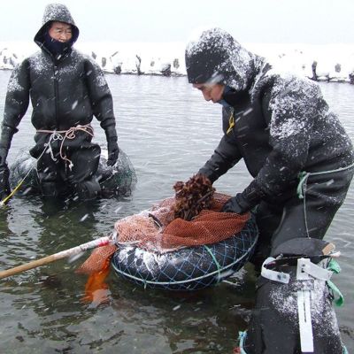 銀杏草の漁は、氷点下となる寒空の中、ウェットスーツに身を包み、岩場などに生えている銀杏草を手作業で摘んでいきます。