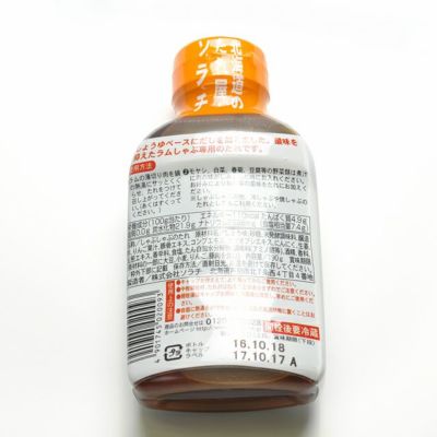 醤油(国内製造)、砂糖、米発酵調味料、醸造酢、豚骨エキス、濃縮りんご果汁、昆布エキス、かつお節エキス、生姜、にんにく加工品、玉葱エキス、香辛料、食塩、たん白加水分解物/調味料(アミノ酸等)、酒精、香料、香辛料抽出物、(一部に小麦・大豆・豚肉・りんごを含む)