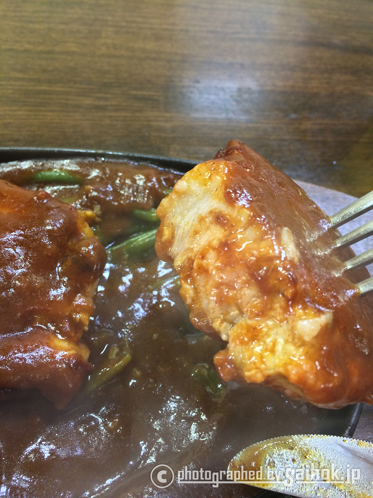 熱々の鉄板の上に濃厚なデミグラスソースがのっているのですが、今にもこぼれそう。付け合わせのお野菜は、肉の下に隠れてしまって見ることができません。