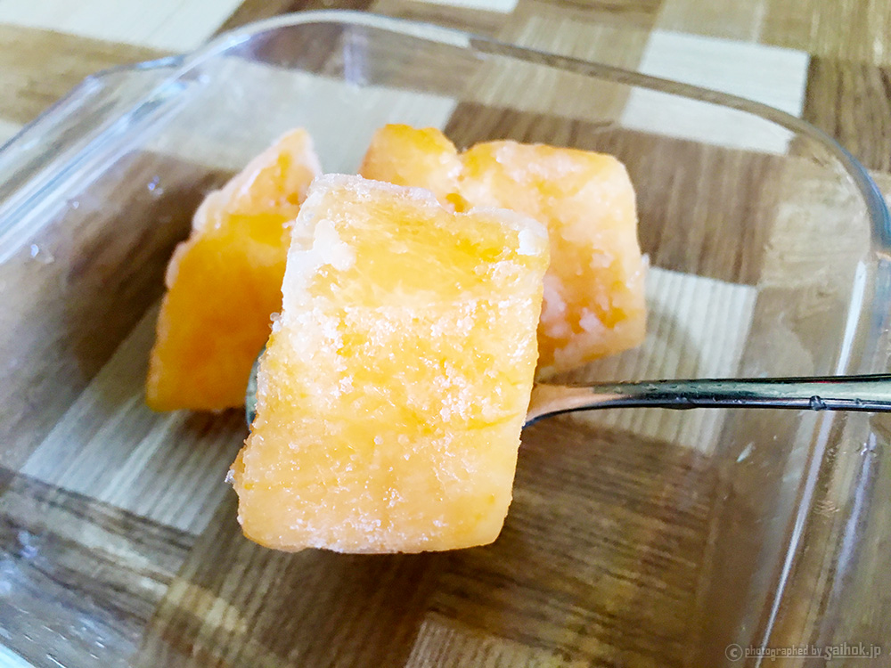冷凍庫から出して、10分くらいおいておくとじんわり溶けてきてシャーベットのように食べられるんです。