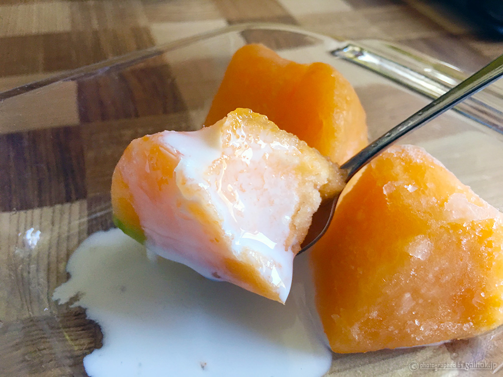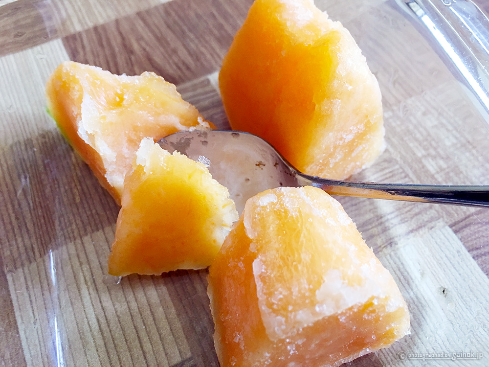 せっかく先ほど冷凍メロンについてご紹介したので、メロンシャーベット。と言っても、冷凍メロンを器にうつすだけのずぼらレシピです(笑)