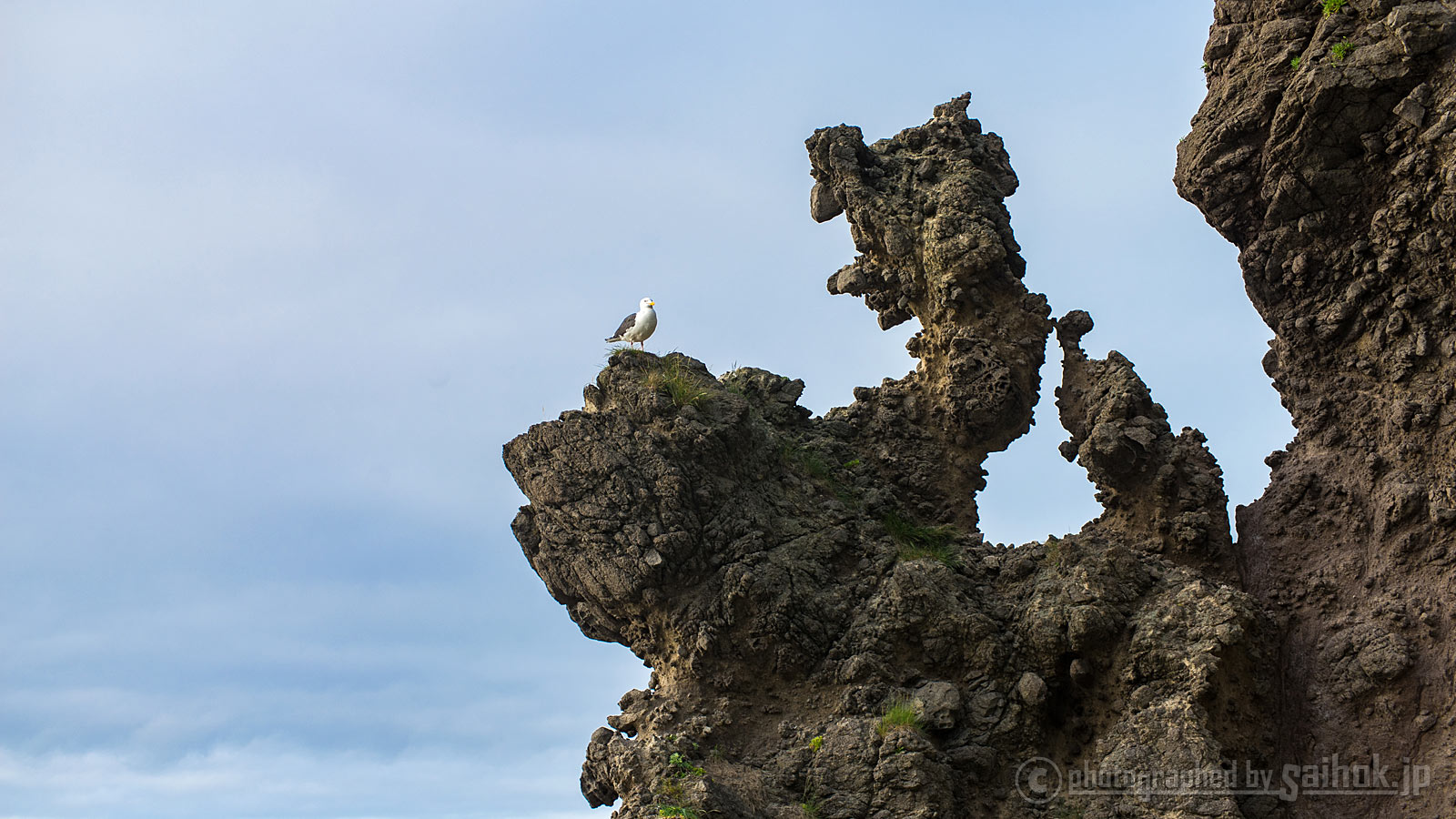 入り組んだ岩は、元々溶岩であったようなぼこぼことした形状が特徴的ですね。浸食された部分に、ちょうどカモメの休息場所にちょうど良いところがあったようです。