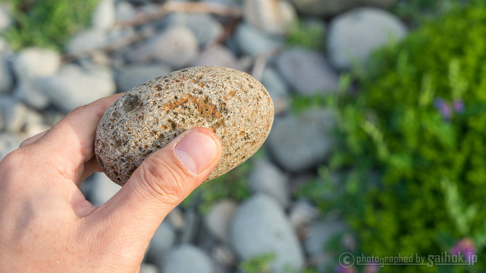 気泡がたくさん空いていて、間違いなく溶岩が固まったものだとわかります。それが、何百万年もの歳月をかけて波に洗われた結果、こんなに丸くなってしまったかと思うと、時間の長さを実感できます。
