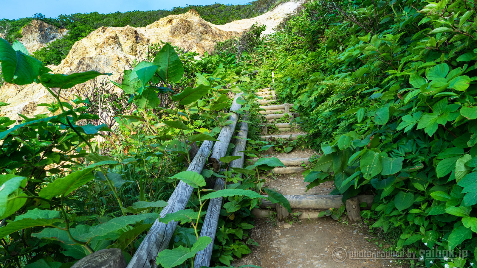 「島武意海岸」とのことでしたが、海岸線はずっと下のほうにあります。断崖絶壁沿いにジグザグと作られた階段をゆっくりと降りて行くことにしましょう。階段といっても、きちんと整備されたものではありませんので靴などは慎重に選んだほうがいいかもしれません。