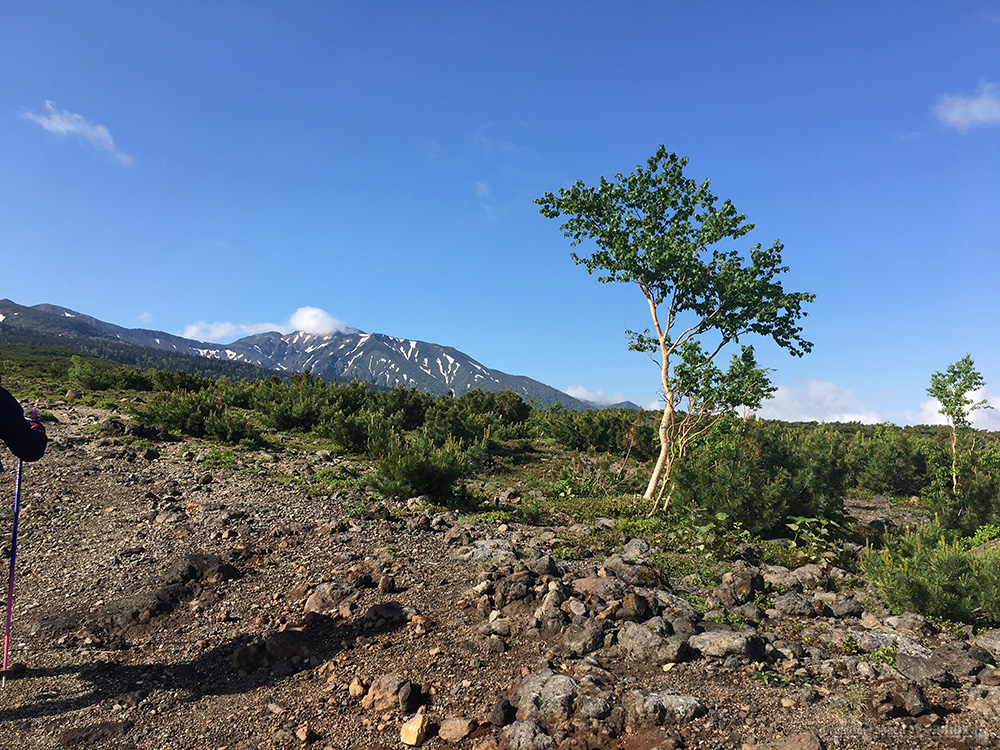 さらに標高が高いところからスタートするので、とても涼しくて空気も美味しい!こちらは正面に見えるのは、十勝岳(とかちだけ)のおとなりの富良野岳(ふらのだけ)です。
