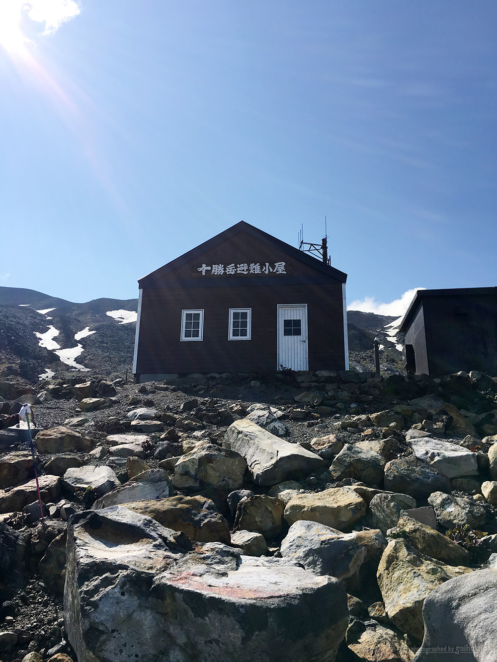 そうして、景色を楽しみながら歩いて1時間くらいすると、十勝岳の非難小屋に到着。