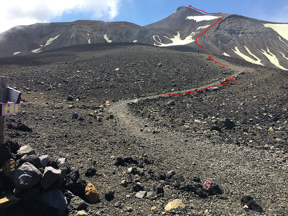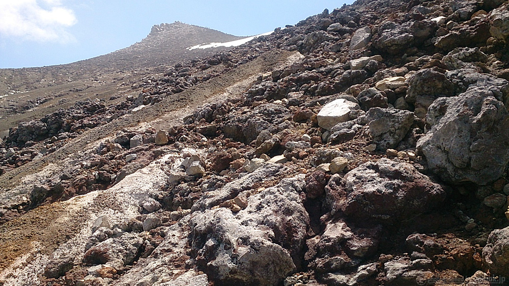 赤い岩場になってきて頂上の岩肌もはっきり見えてきます。そして、少し横を見ると、煙のようなものがあがっているのが見えますね。