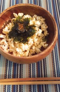 作り方:ゴマ油に塩を混ぜ、ポップコーンに薄く絡めます。 刻んだ韓国のりをトッピングし、お好みで一味を振りかけて完成。