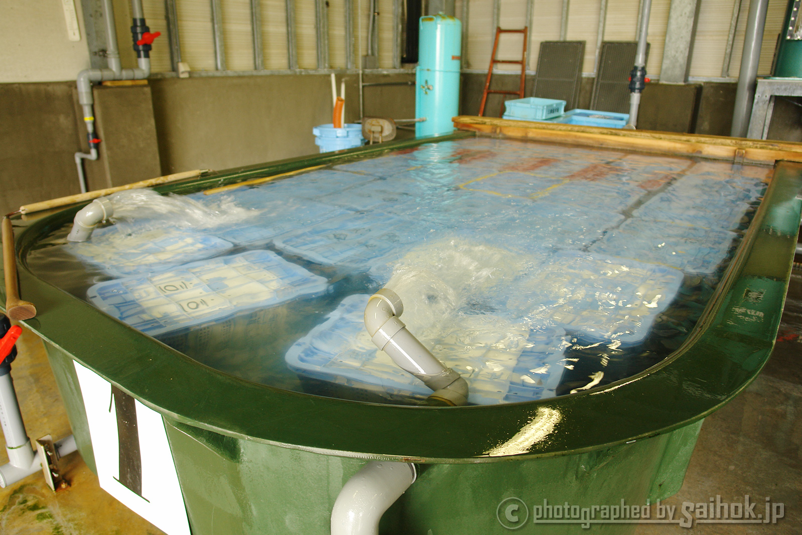ここ虎杖浜では、獲れたての毛ガニの鮮度を保つために、セリが行なわれるまでの間、カゴごと大きな水槽の中に入れて、鮮度を保っています。