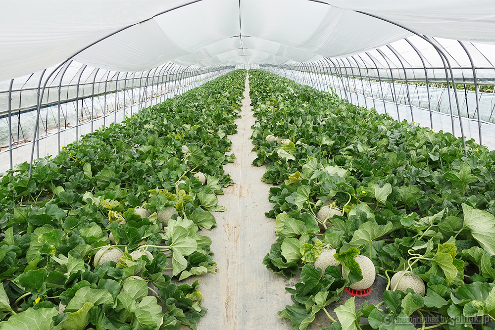 一玉一玉綺麗な丸形に育つように、台座の上に丁寧に置かれており、ぎっしりと張り巡らされたネットがこれぞメロンと感じさせてくれる風貌でした。