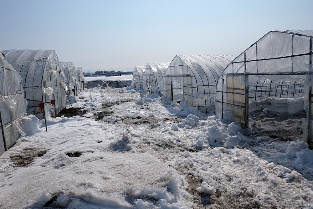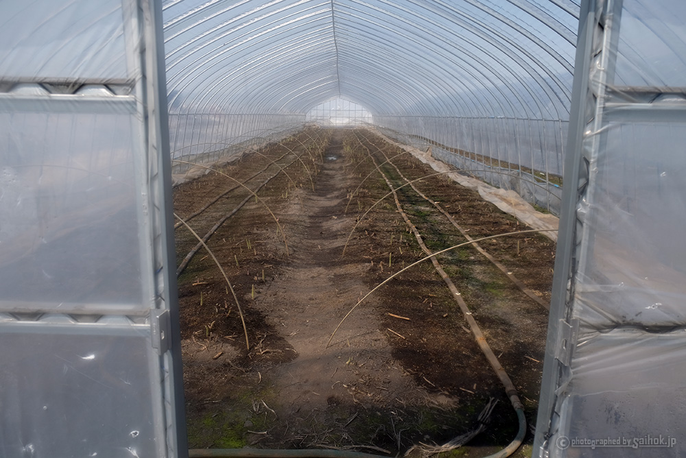 前回のグリーンアスパラのハウスの様子はこんな感じでしたが、今はどんな状況になっているのでしょうか。早速行ってまいりました♪お邪魔してみると、雪はすっかり溶けて土が顔を出しておりました。温室のため、カメラを構えて写すとすぐに曇ってしまってなかなか撮れませんでした。