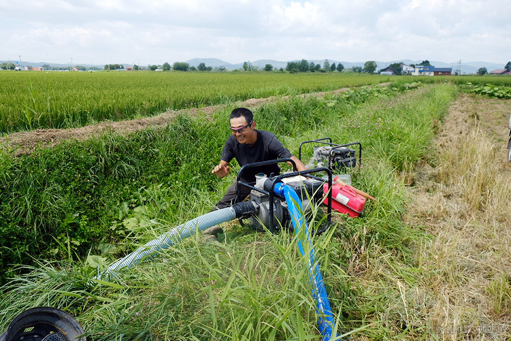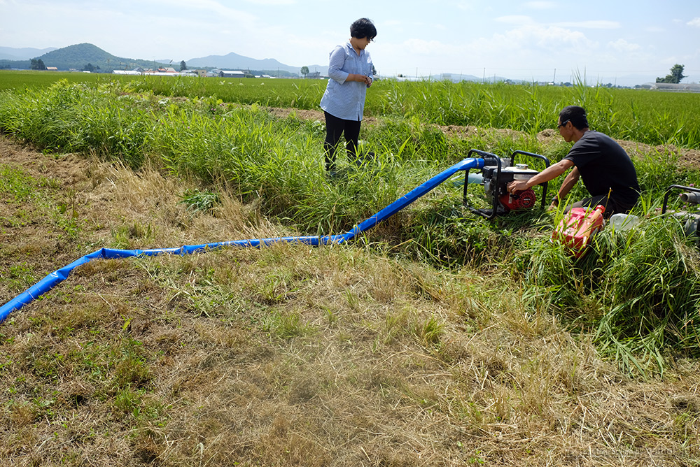 ポンプでくみ上げた水を、チューブを通じてとうもろこしにまんべんなく、一定の水量で水をあげることができるんです。その日は畑にお邪魔すると、なにやら井戸水がうまくくみ上げられず、菅野さんは苦戦している状況でした。
